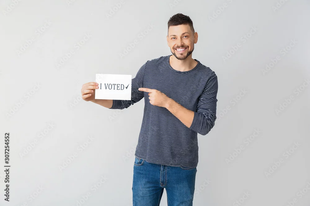 Man holding paper with text I VOTED on light background