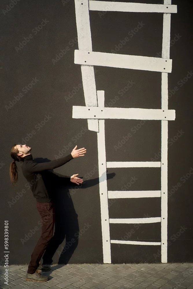 Man in black wear standing sideways with his arms stretched out to illustrated staircase going upwards. The ladder is a visual representation of the social ...