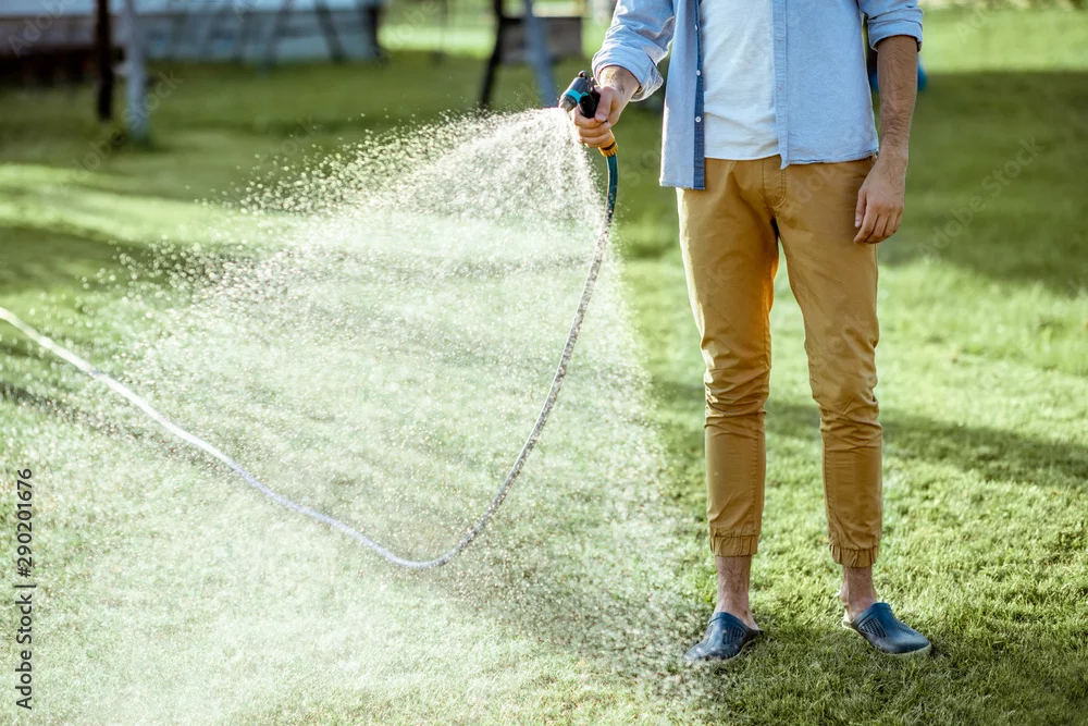 Man watering green lawn, sprinkling water on the grass with water pistol, close-up with no face
