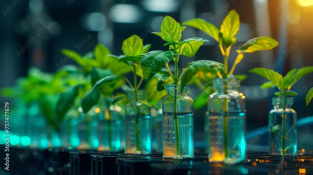 Many green plants in test tubes. Biotechnology, Science of Genetic Engineering. genetically modified plants, laboratory, plants obtained by new genomics ...