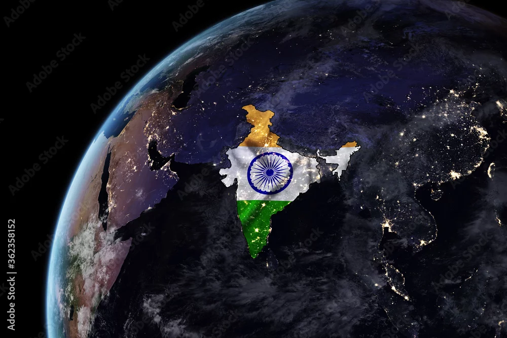 Map of India with embedded national flag at night from space. The surface of the planet and the visible lights of cities. Image elements courtesy of NASA. 3D illustration