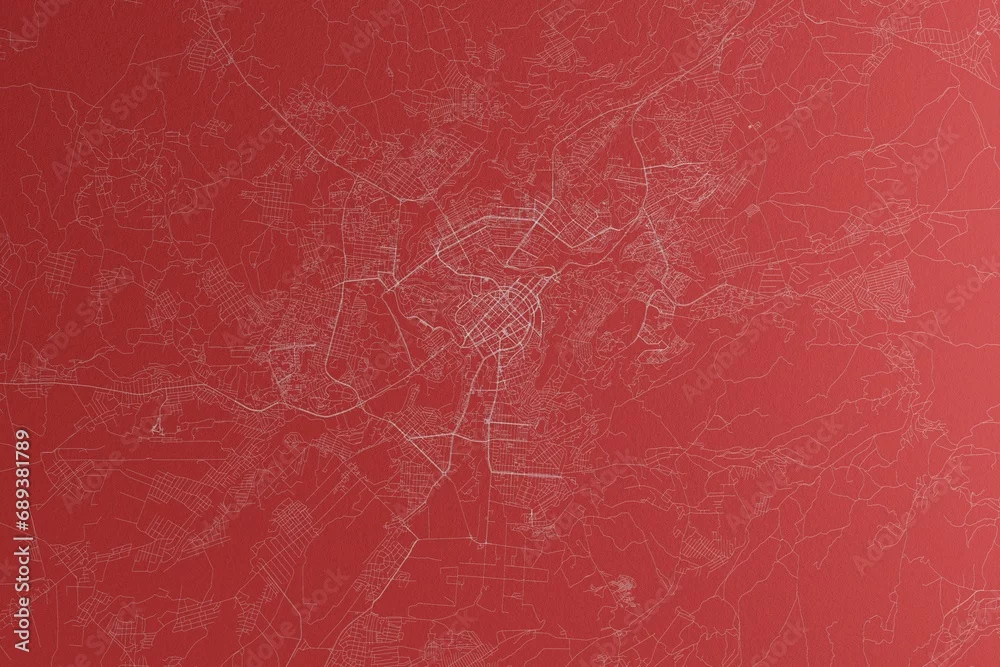 Map of the streets of Yerevan (Armenia) made with white lines on red paper. Top view, rough background. 3d render, illustration