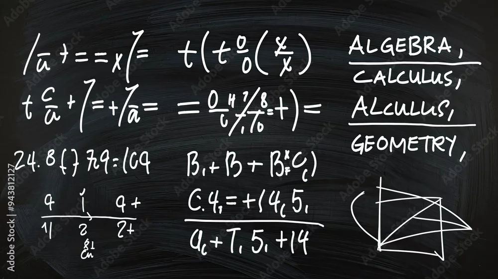 Math equations written in white chalk on a dark chalkboard background, showcasing various mathematical formulas and symbols in a classic educational ...