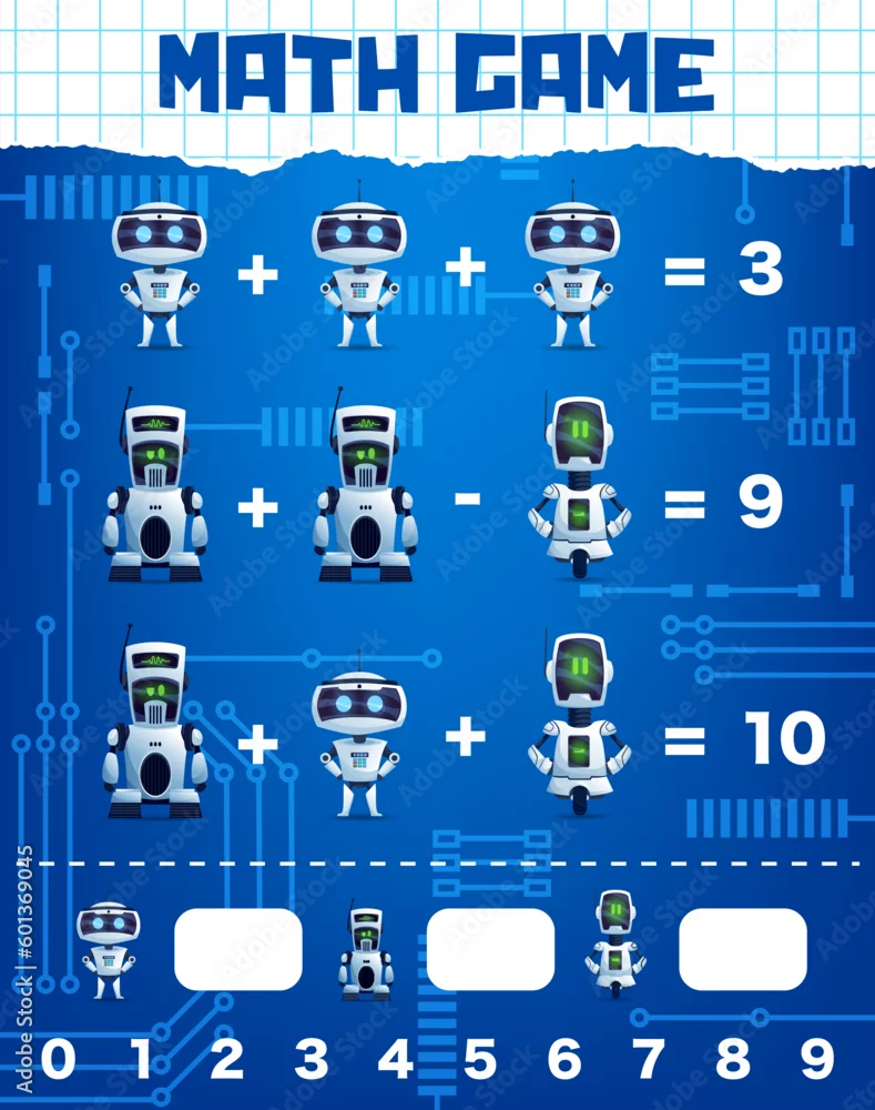 Math game worksheet. Cartoon robot characters. Child education playing activity, kids math vector puzzle or children mathematical game with alien robots, ...