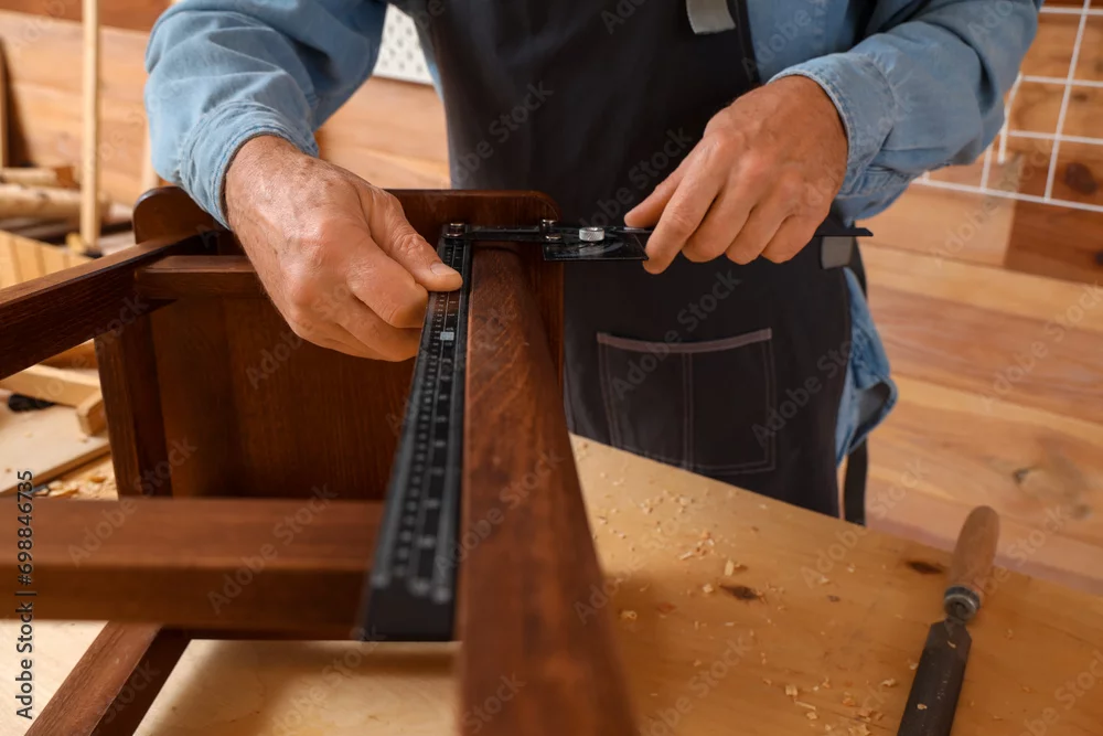 Mature carpenter measuring wooden stool at table in shop, closeup