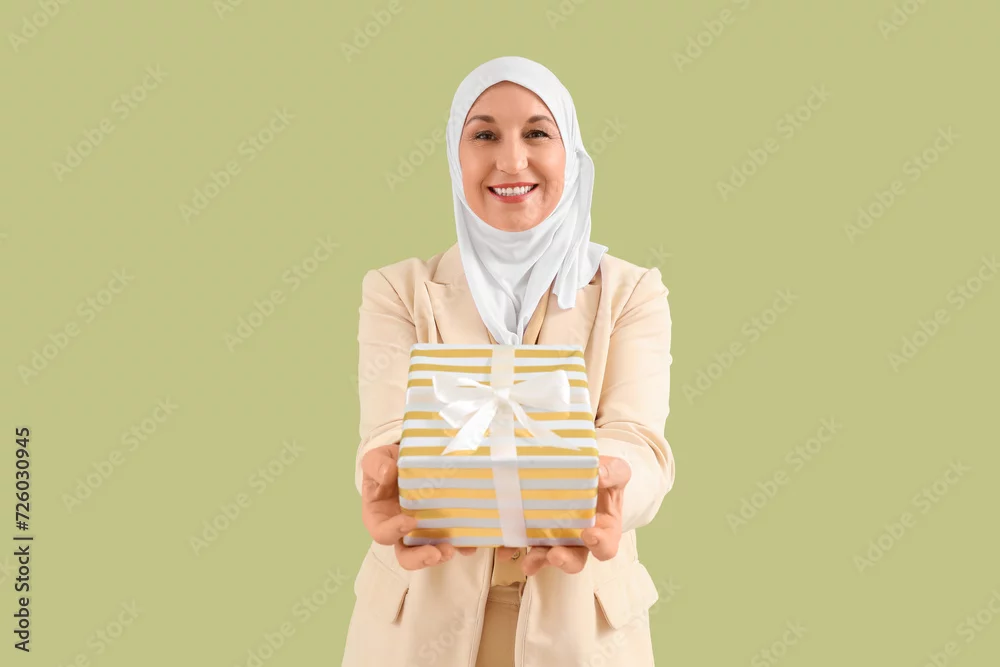 Mature Muslim woman with gift box on green background. Ramadan celebration