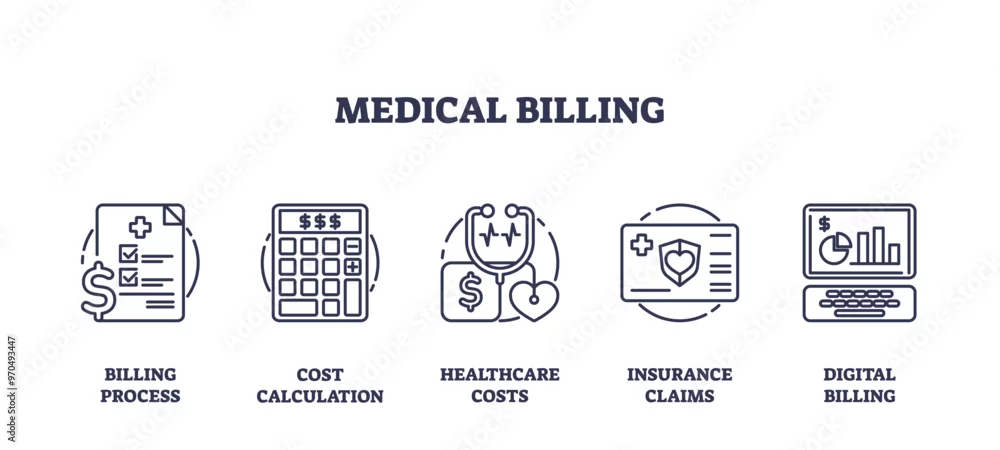 Medical billing and healthcare expenses calculation outline icons collection. Labeled elements with billing process, cost measurement, insurance claim ...