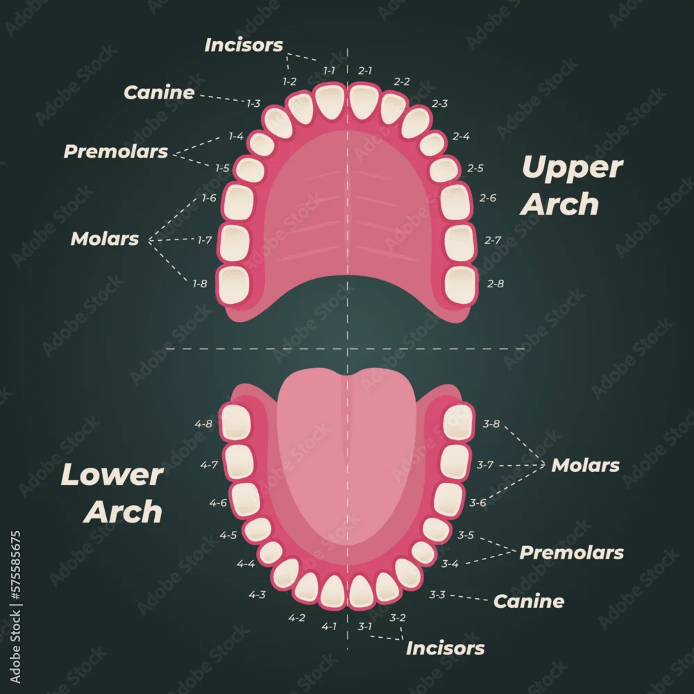 Medical dental diagram illustration. Orthodontist human tooth anatomy. Vector infographics with teeth diagrams.