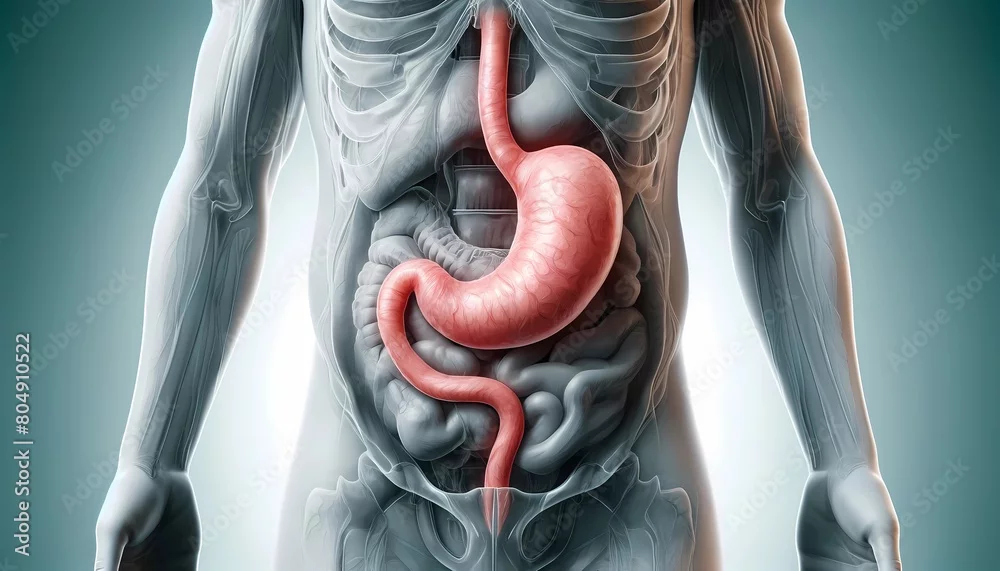 Medical illustration of stomach and intestines with precise anatomical position Concept of gastrointestinal health medical education and digestive ph ...