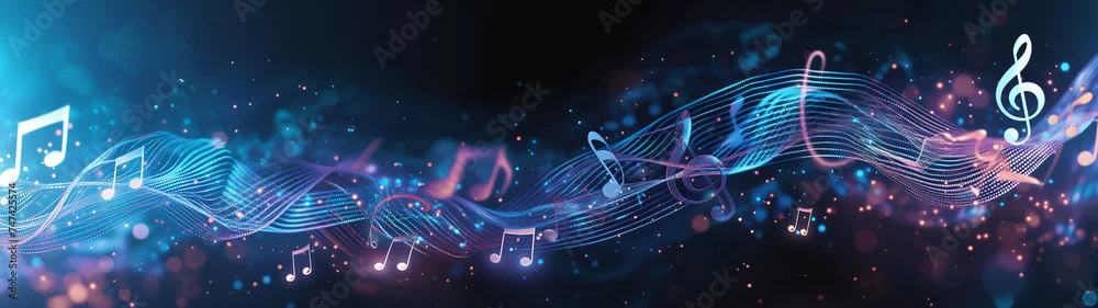 Melody flowing music wave abstract background showing colourful music notes which are musical notation symbols, panoramic stock illustration image