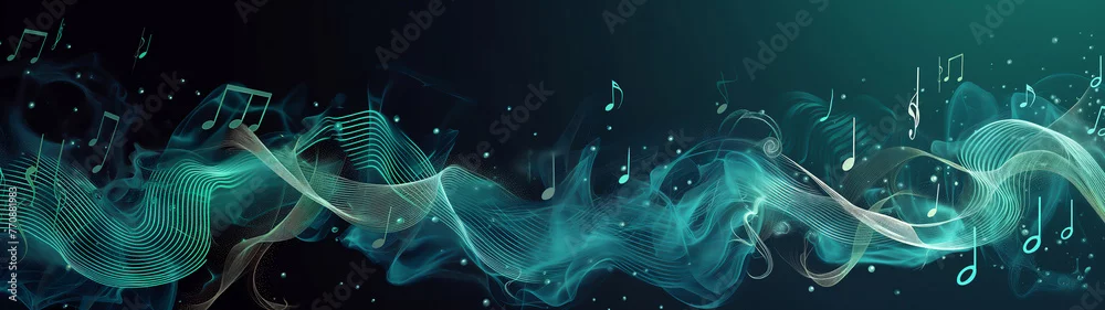 Melody flowing music wave abstract background showing colourful music notes which are musical notation symbols, panoramic stock illustration image