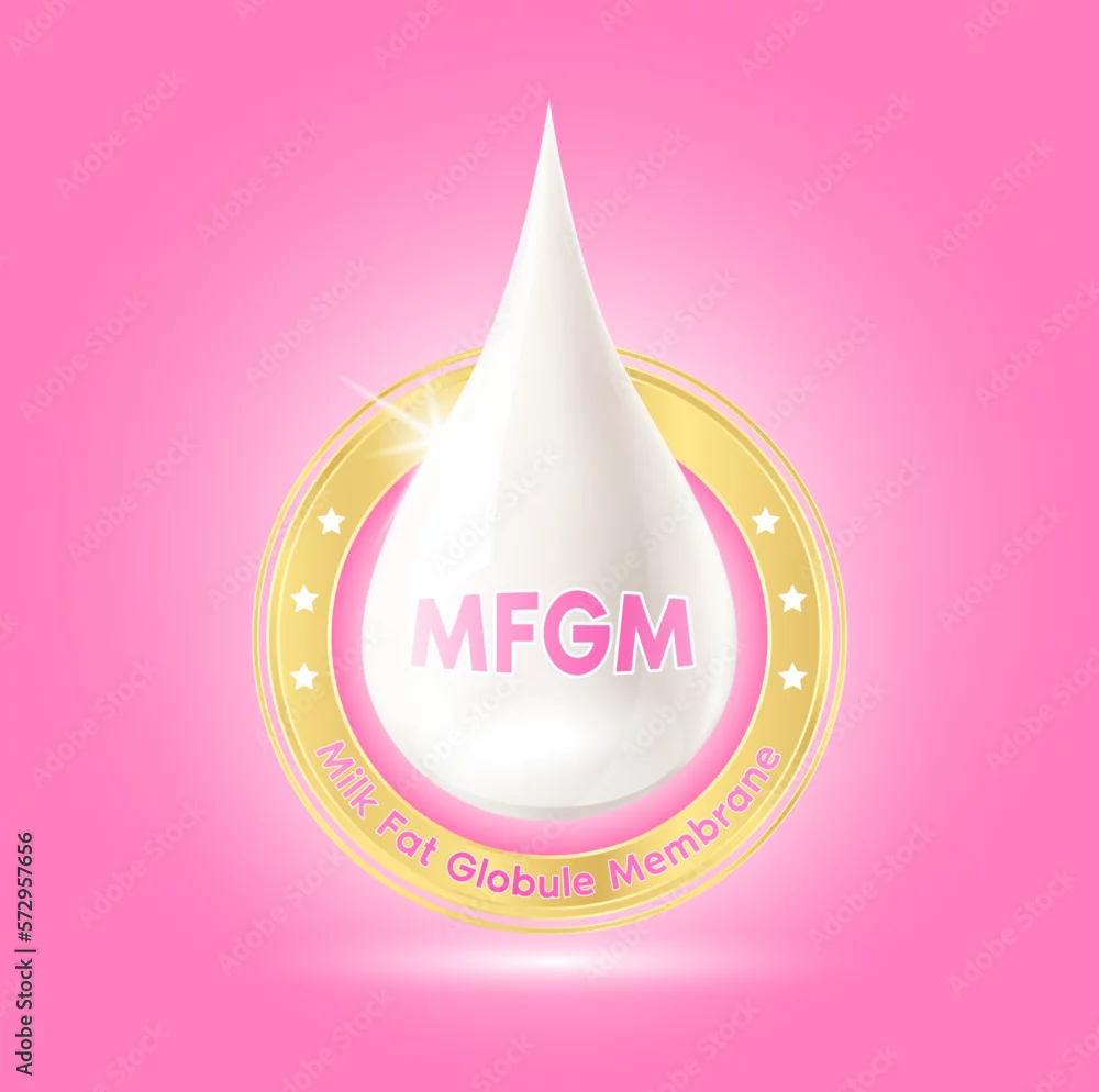 MFGM (Milk Fat Globule Membrane) Vitamins and omega DHA in milk droplets. Essential amino acids for body infant health. Products design supplement food. ...