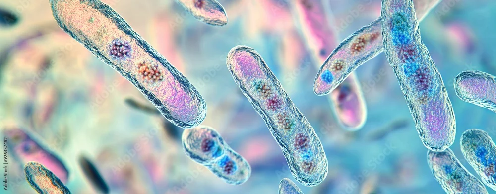 Microscopic examination of gut microbiota, focusing on different bacterial species with detailed textures and accurate color coding, clear light, realistic ...