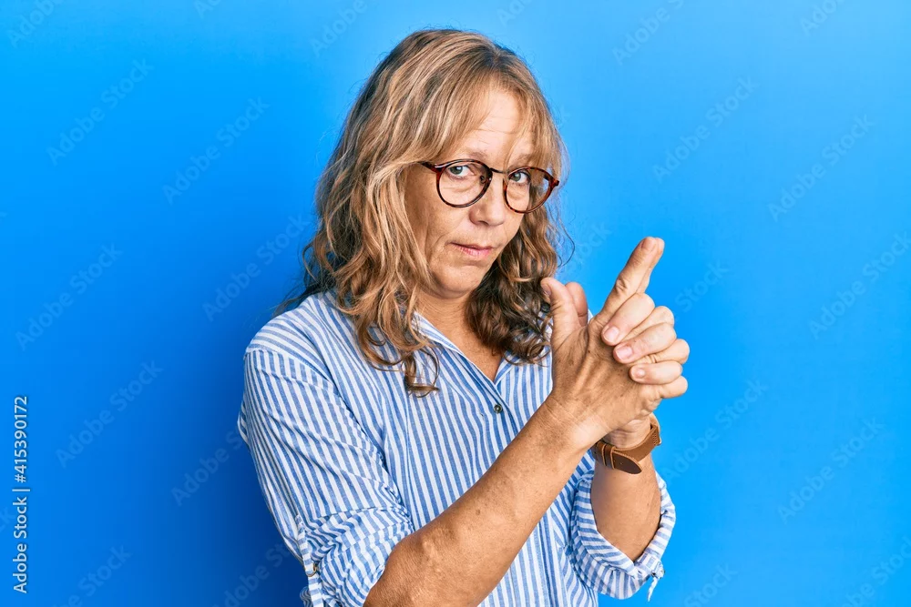 Middle age blonde woman wearing casual clothes and glasses holding symbolic gun with hand gesture, playing killing shooting weapons, angry face