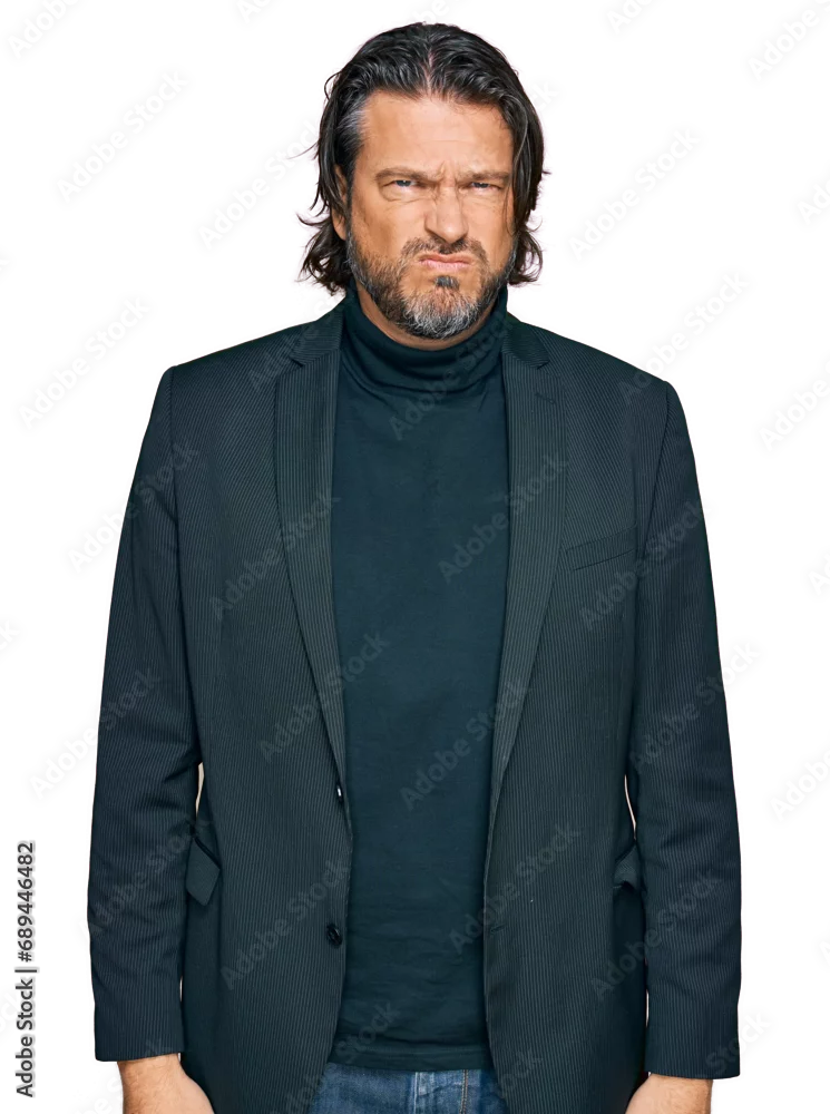 Middle age handsome man wearing business clothes skeptic and nervous, frowning upset because of problem. negative person.
