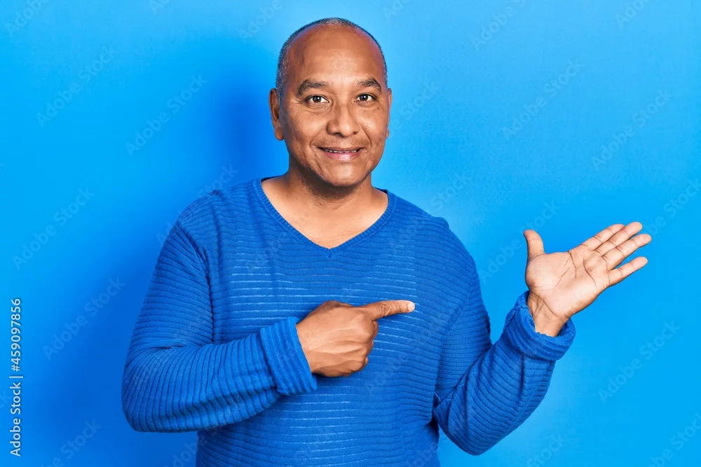 Middle age latin man wearing casual clothes amazed and smiling to the camera while presenting with hand and pointing with finger.