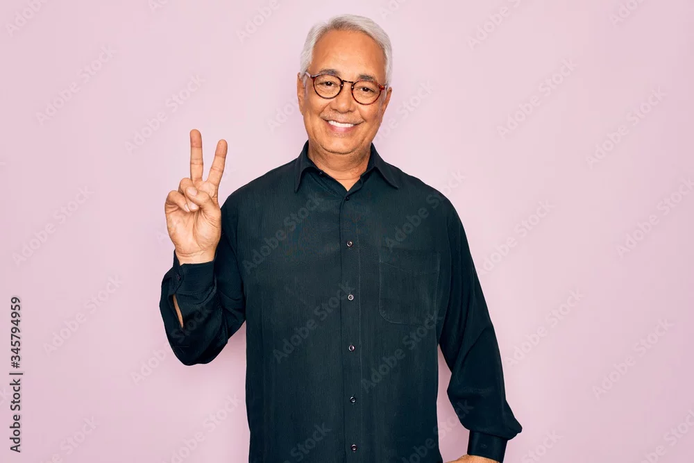 Middle age senior grey-haired handsome man wearing glasses and elegant shirt smiling with happy face winking at the camera doing victory sign. Number two.