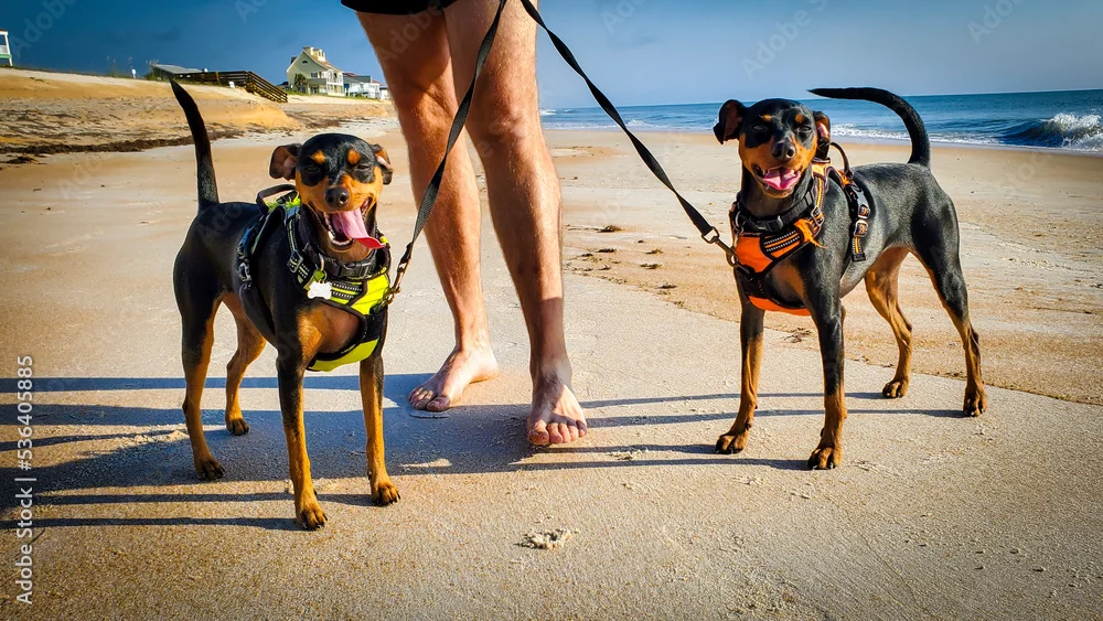 Miniature Pinscher sisters going for a walk on the beach in Florida attached to a harness and tether.
