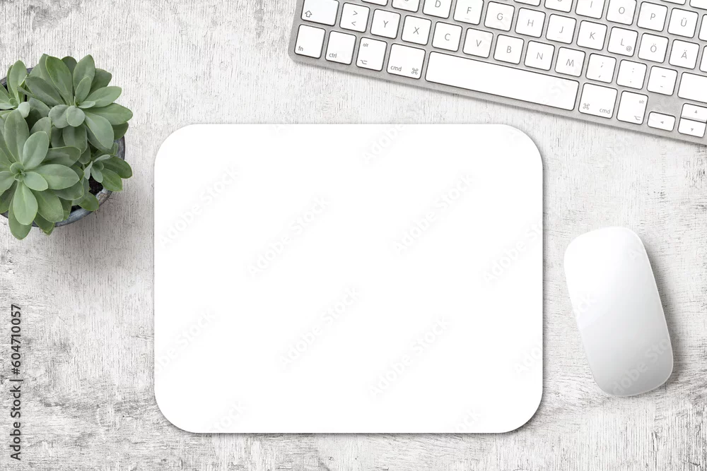 minimalist mousepad mockup with pad, mouse, keyboard and a potted succulent on a white wooden office desk, modern minimal workspace template for your product ...