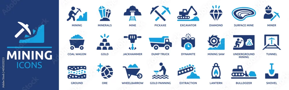 Mining icon set. Containing minerals, gold, pickaxe, miner, excavator, diamond, coal wagon, jackhammer and gold panning icons. Solid icon collection. Vector ...