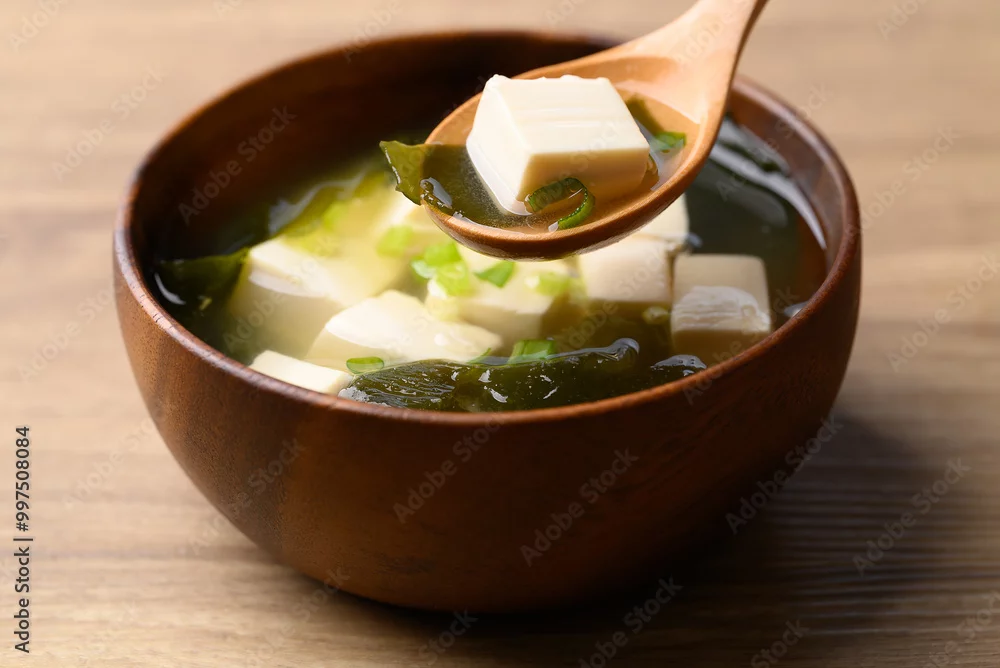Miso soup with tofu, wakame seaweed and spring onion, Traditional Japanese soup