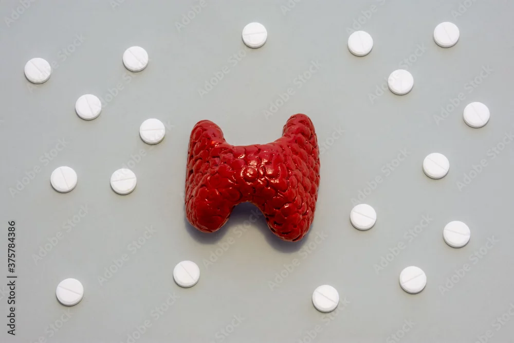 Model or figure of thyroid gland, which corresponds to anatomical original, is located in grey background surrounded by white pills ornamented in polka ...