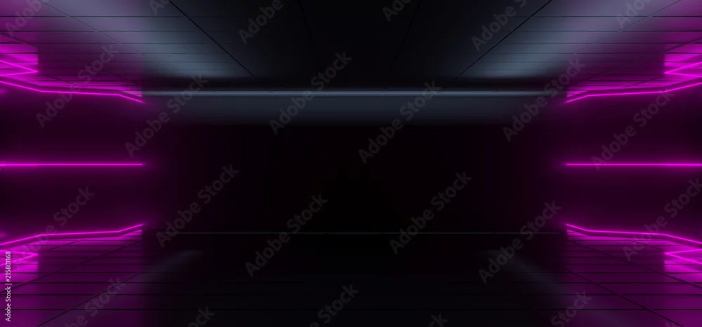 Modern Futuristic Hi-Tech Dark Room With Neon Glowing Light Tubes With Purple Color And Empty Space In Middle 3D Rendering