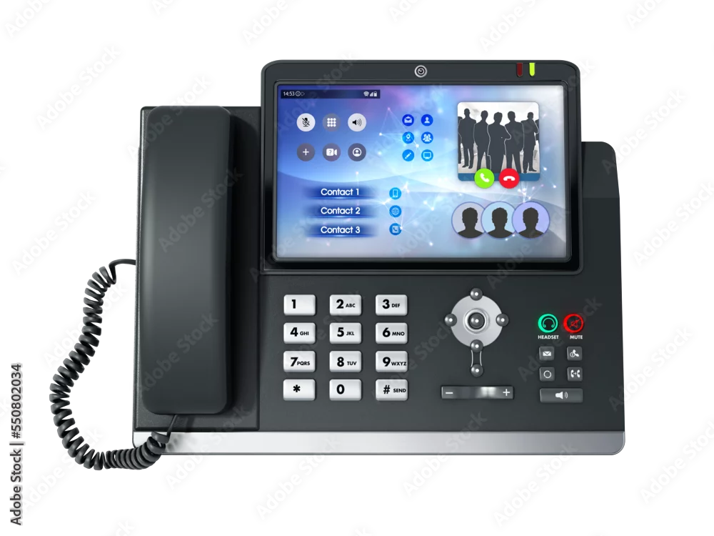 Modern VoIP or Voice over IP phone with LED screen on transparent background