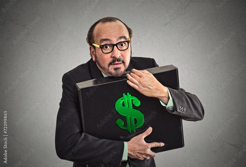 Money greed corporate executive with case bag filled with money