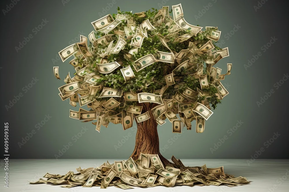 Money tree, tree with banknotes, tree with money leaves, grey background, Generative AI
