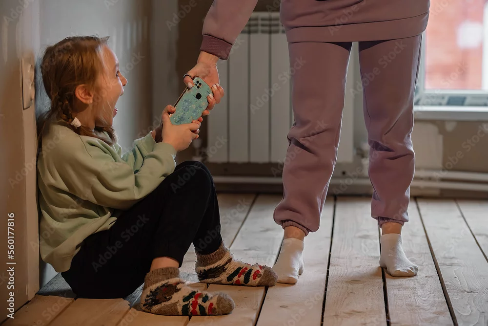 mother takes the phone away from her teenage daughter in the attic at home, the girl screams loudly .quarrel between parents and children, parenting problems