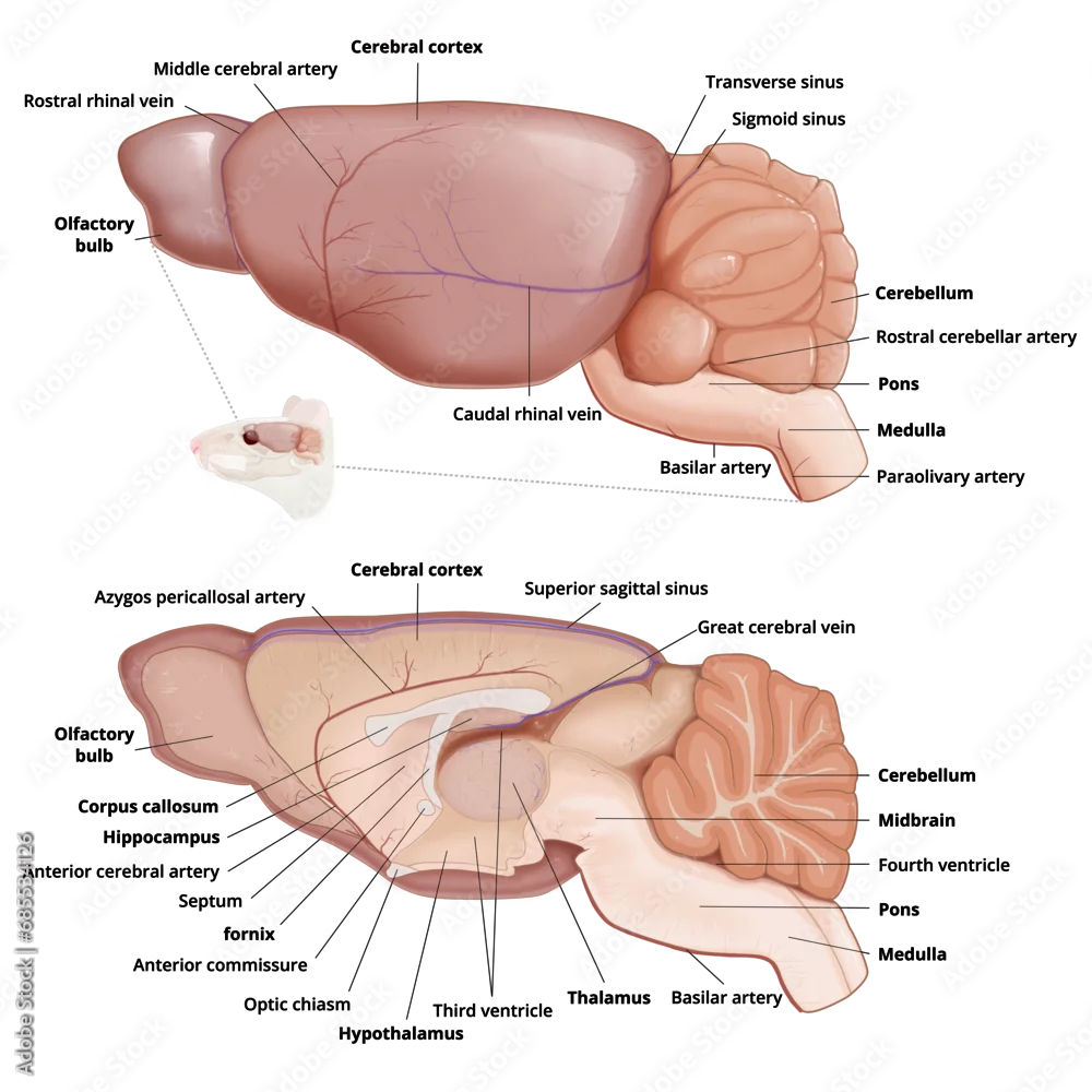 Mouse brain anatomy diagram with annotation. Lateral view and sagittal section of the brain. Medical infographic, isaolated on transparent background.