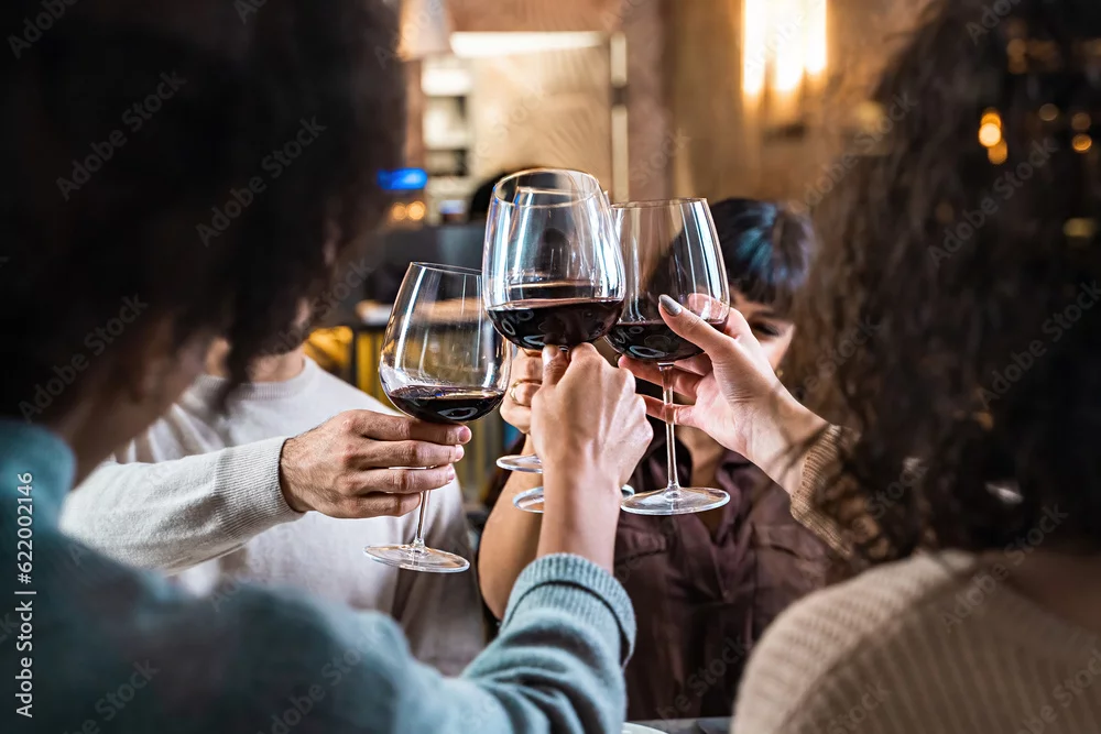 Multicultural Friends Toasting in Elegant Restaurant - Friends raising wine glasses in a toast, captured through a window.