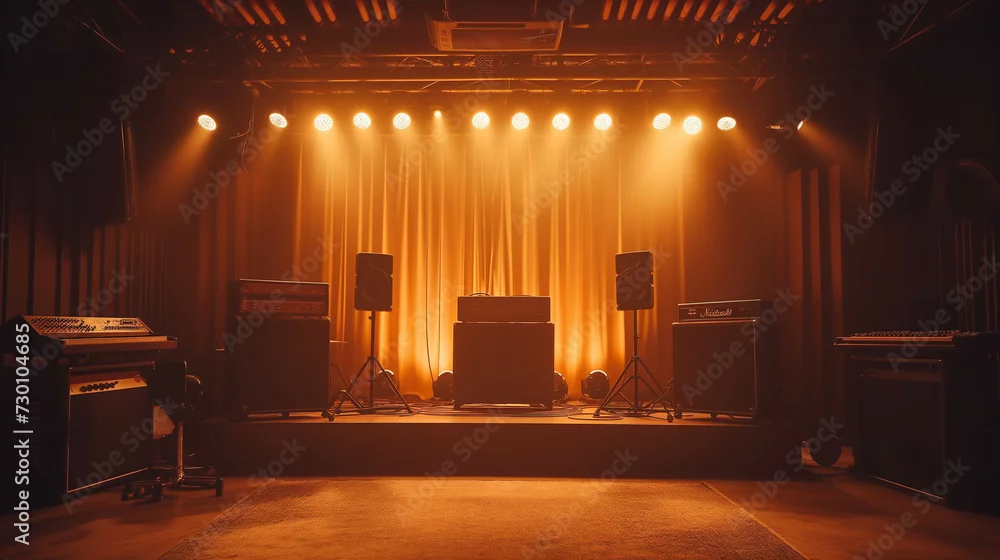 Music rehearsal studio with Drum Set in the Middle, sound mixing console, digital control panel for audio record
