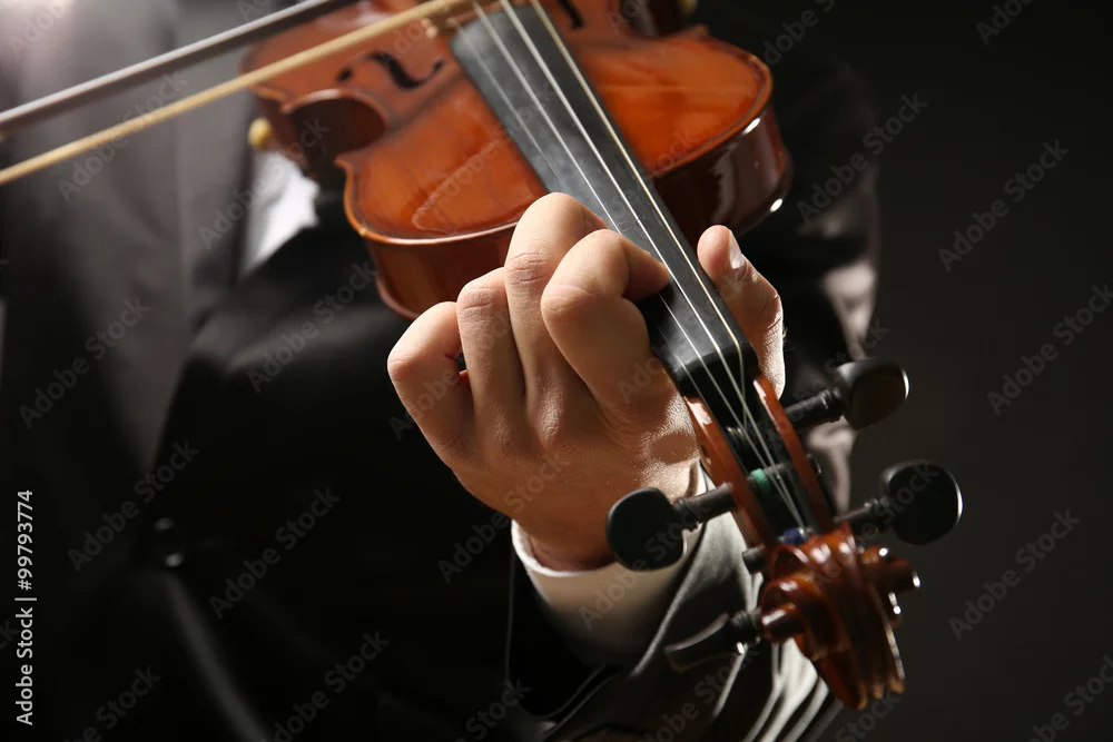 Musician play violin on black background, close up