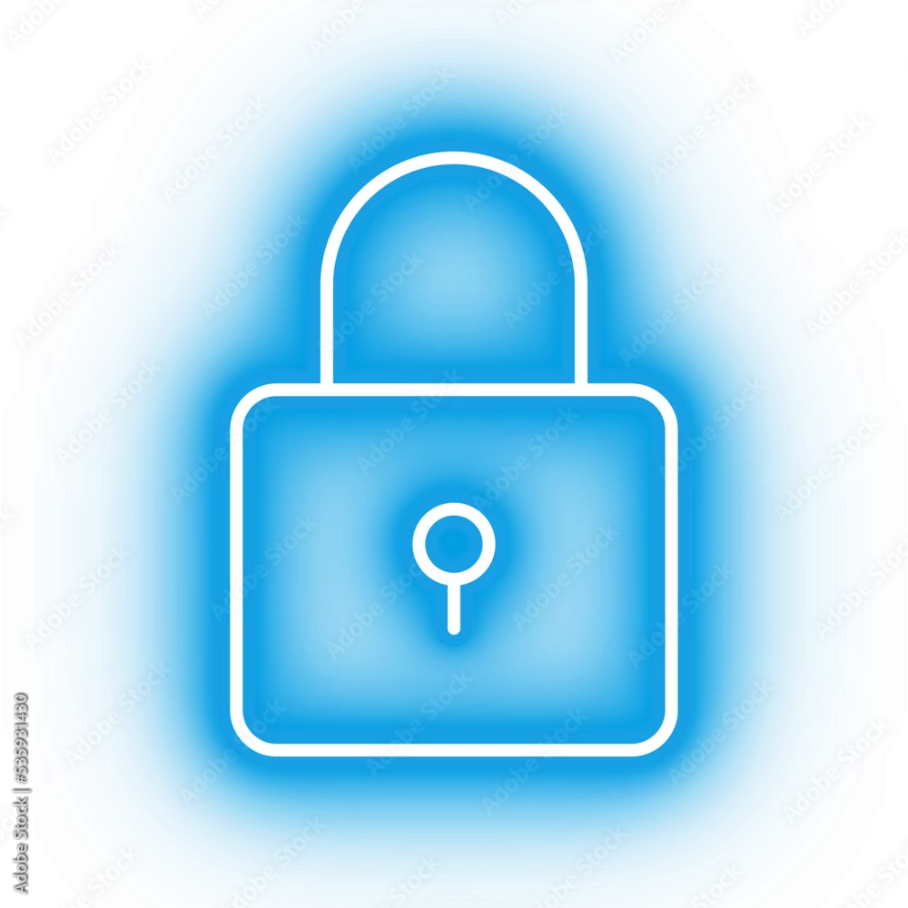 Neon blue lock icon, glowing closed lock icon on transparent background