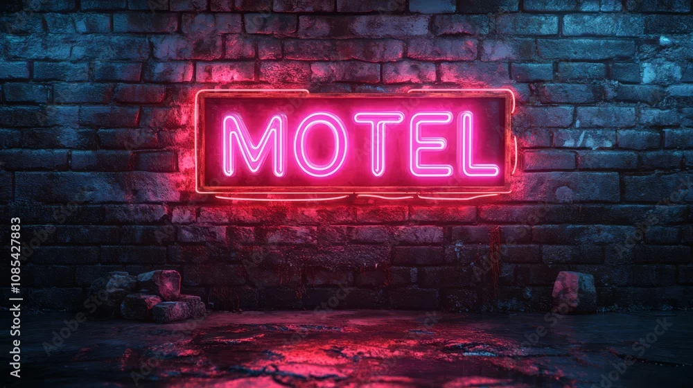Neon Motel Sign: A vintage motel sign glows brightly in the dark, casting a pink hue on the weathered brick wall and concrete floor. The neon lights illuminate ...
