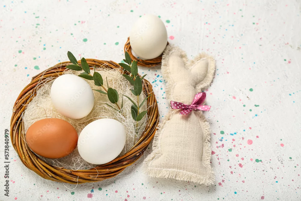 Nest with Easter eggs, eucalyptus branches and bunny on white background