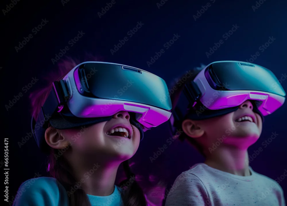New generation Kids Using VR Headsets to Immerse Into New VR Gaming Worlds. Gen Alpha Digital Natives with Virtual Reality Smart Glasses.