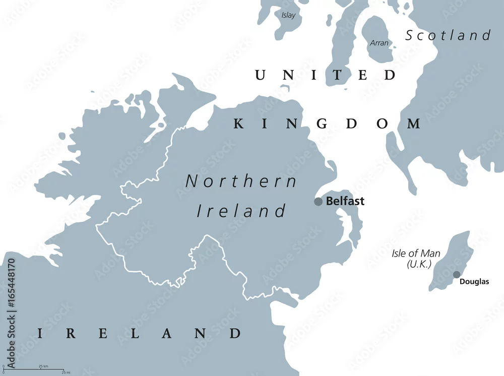 Northern Ireland political map with capital Belfast. Country of the United Kingdom in the northeast of the island of Ireland. Gray illustration isolated ...