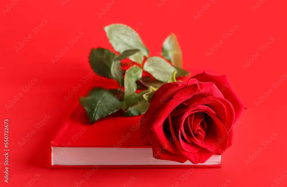 Notebook and beautiful rose flower on red background
