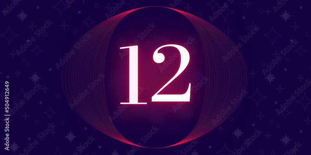 Number 12. Banner with the number twelve on a blue background and blue and purple details with a circle purple in the middle