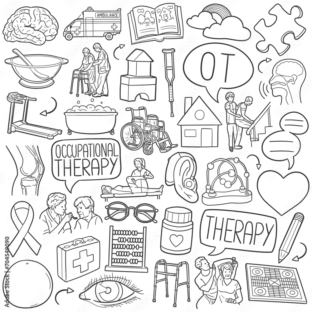 Occupational Therapy Doodle Icons Black and White Line Art. Therapist Clipart Hand Drawn Symbol Design.