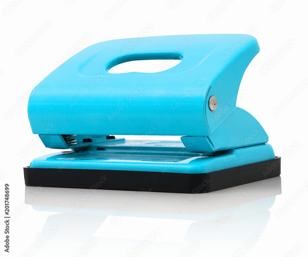 Office paper perforator isolated on white background with shadow reflection. Office tool that is used to create holes in sheets of paper. Paper Metal Stationary ...