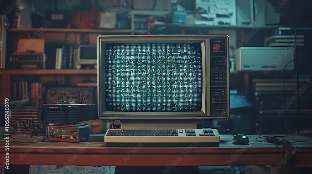 Old CRT monitor with visible reflections and pixelated display on a modern desk setup evoking a blend of eras