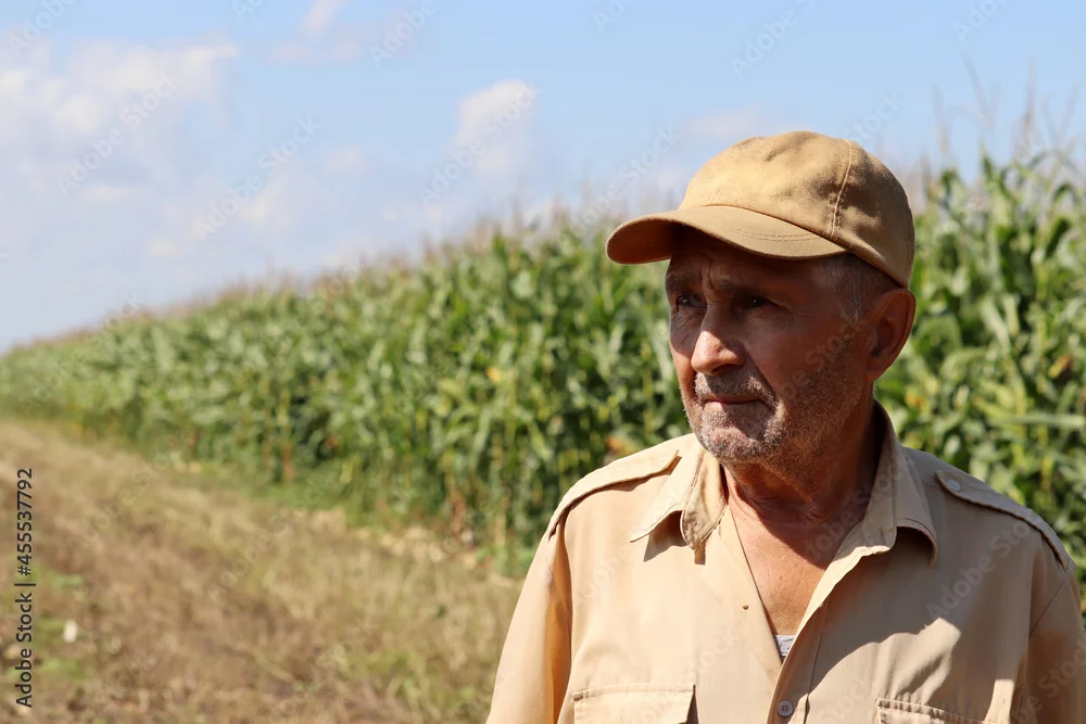 Old man stands on a green cornfield, elderly farmer in baseball cap inspects the crop. Villager on farm in a sunny day on background of high corn stalks