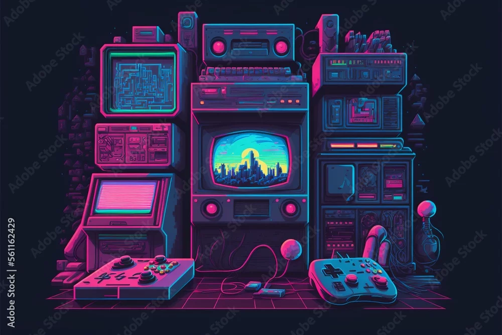 Old video game console with landscape in the background, 16 bit pixel art. Digital illustration. AI