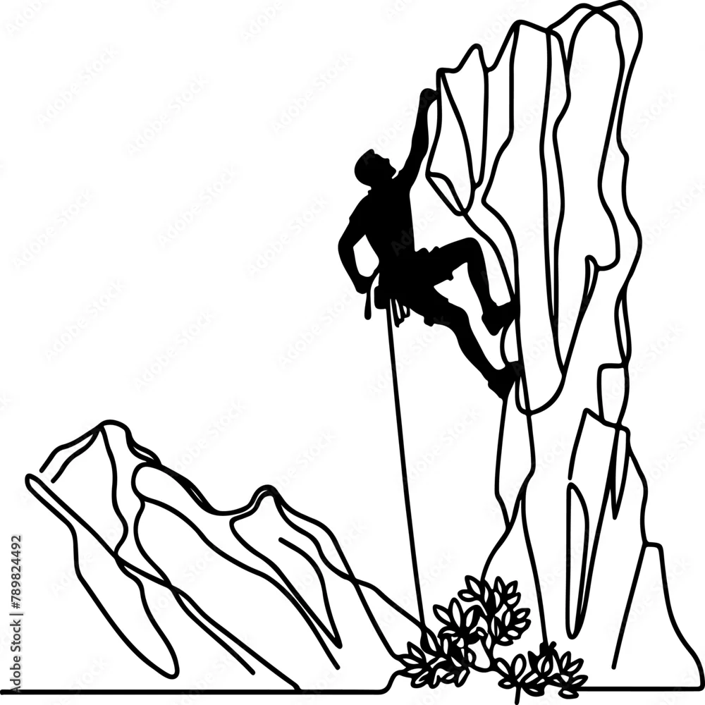One continuous black line drawing of man rock Climbing a steep rocky cliff Doodle linear drawing cartoon on white background. vector