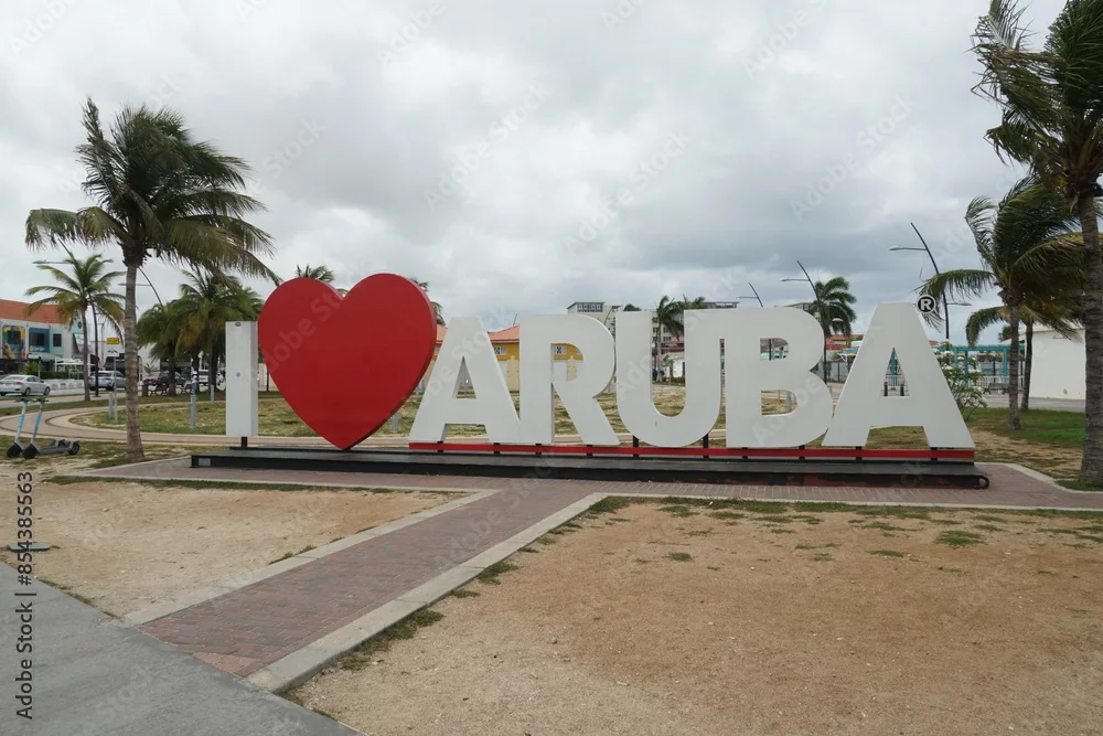 Oranjestad, Aruba, May 24, 2024: Big sign I love Aruba with red heart between letters exhibit near center of Oranjestad for tourist which are taking photo as memory. Thera are palm trees.