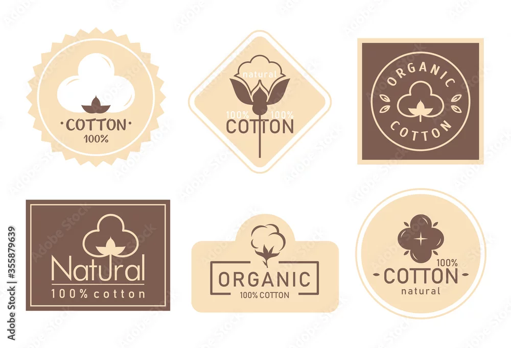 Organic cotton label vector illustration set. Mark logo icons collection with cottonseed branch plant symbol emblem, natural bio organic product, fabric ...